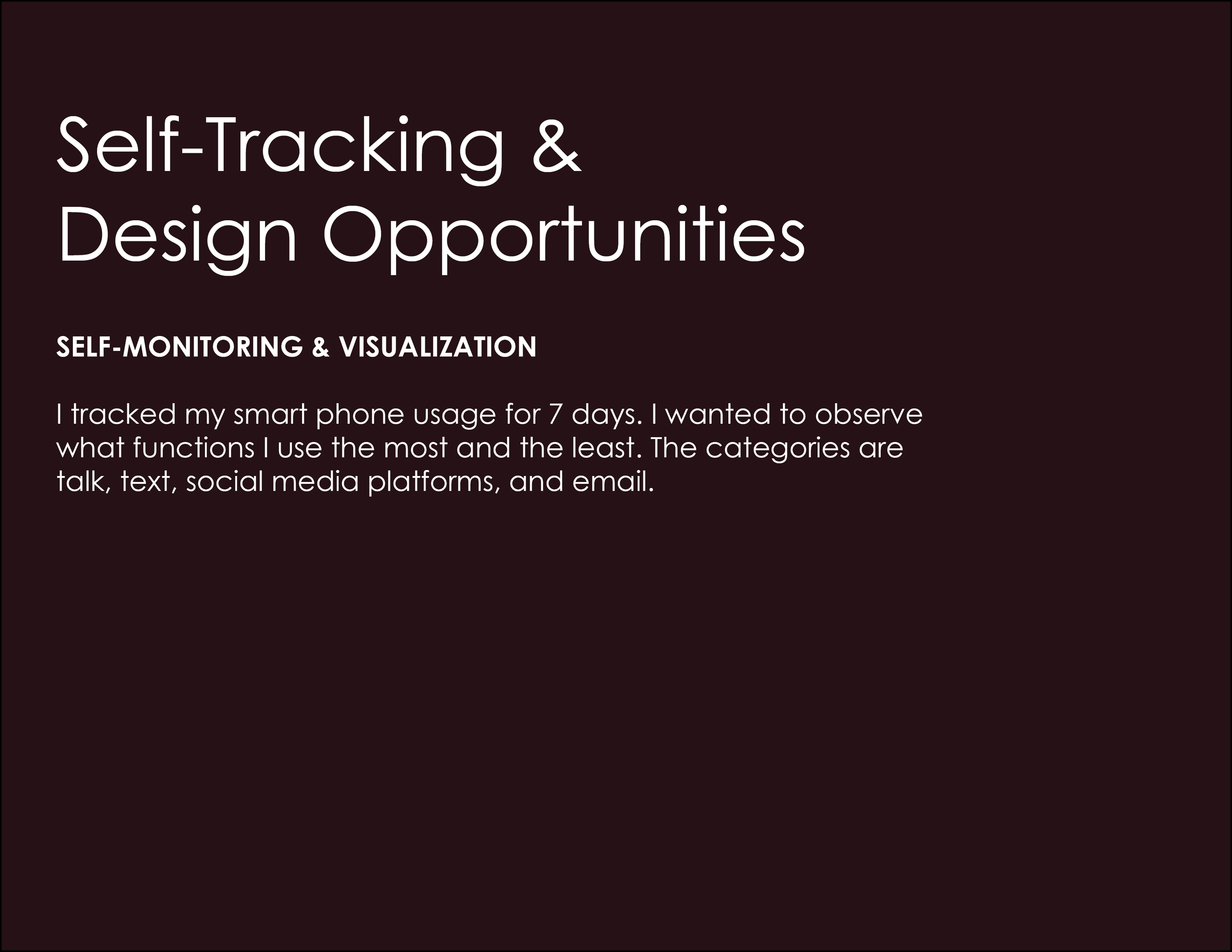 I conducted self-tracking to develop design opportunities. I tracked my smartphone usage for 7 days. I wanted to observe what functions I use the most and the least. The categories are talk, text, social media platforms, and email.